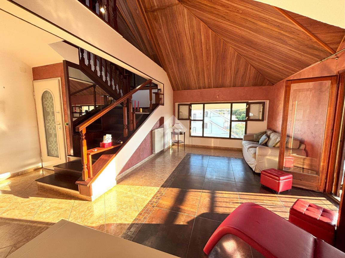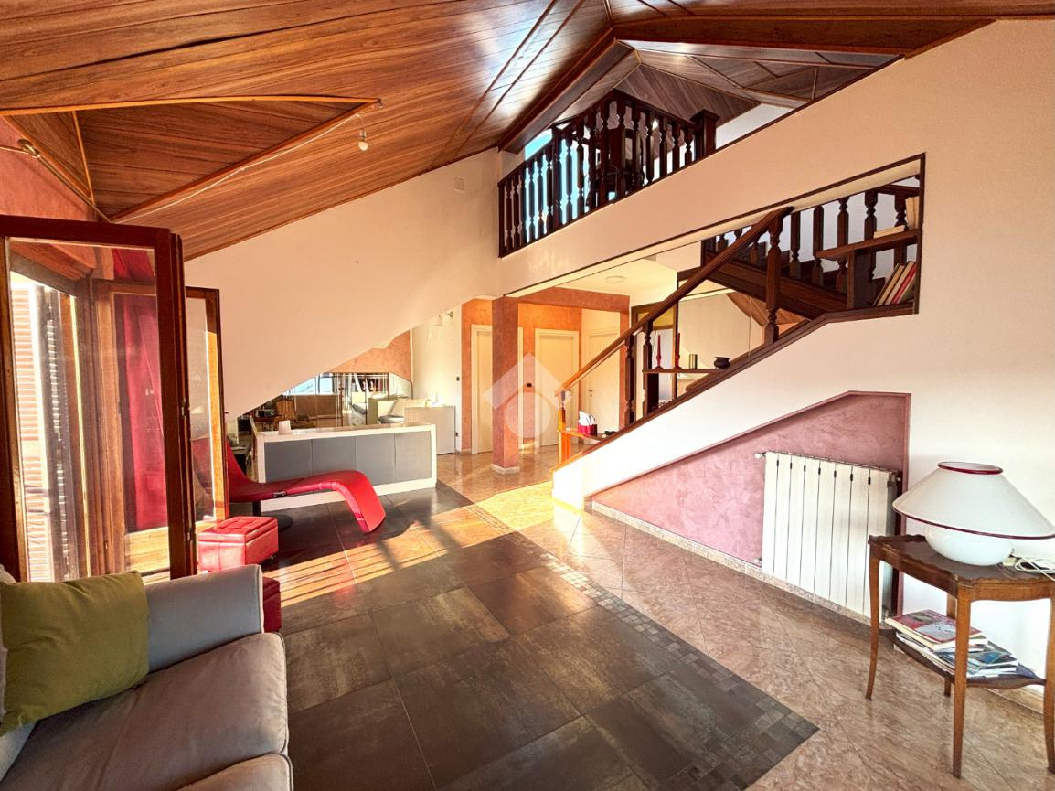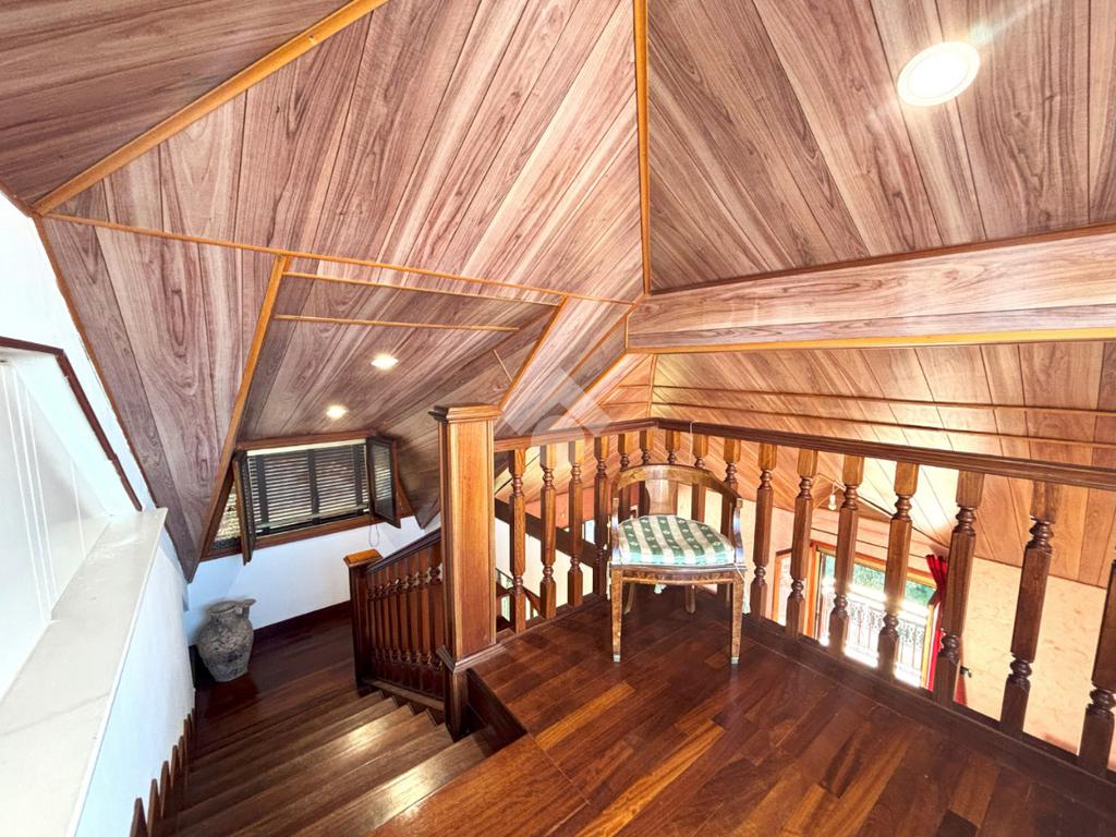 Una comoda scala in legno ci conduce al piano superiore, dove troviamo un disimpegno che può essere adibito a zona relax, con la possibilità di ammirare l’effetto delle diverse altezze del soffitto. A completare questo ambiente, alcuni armadi a muro utili per riporre oggetti poco utilizzati.