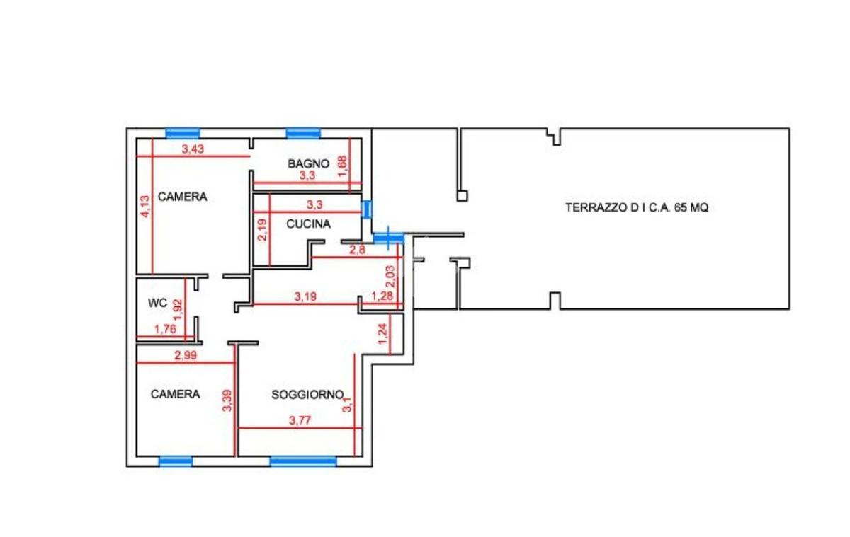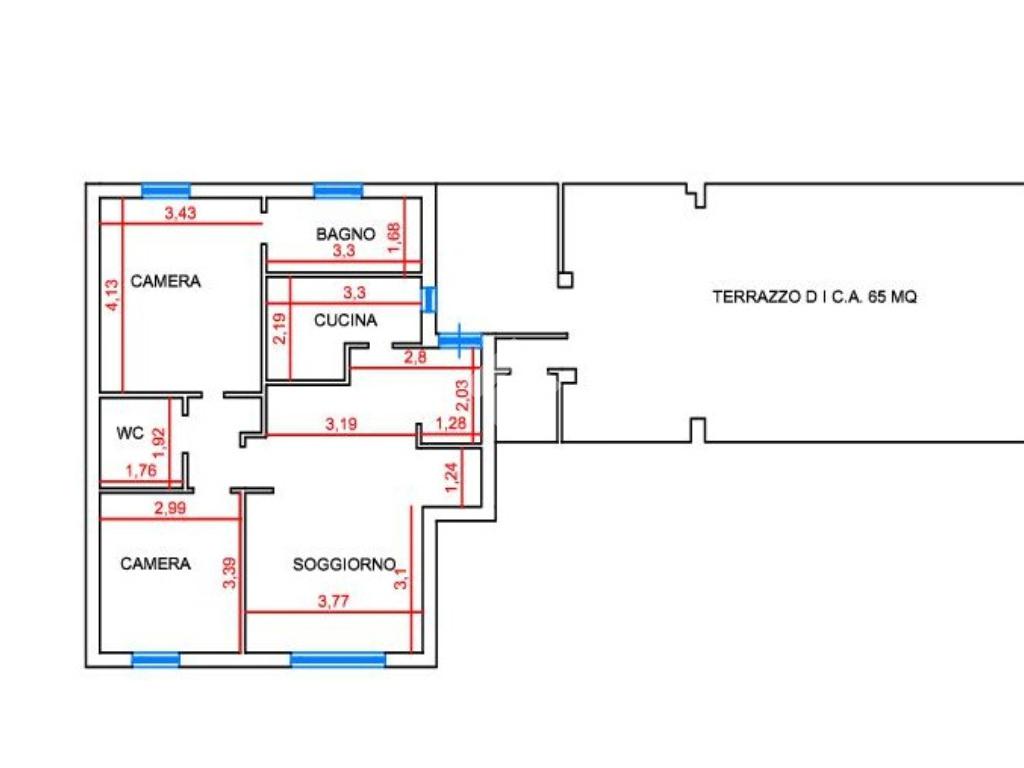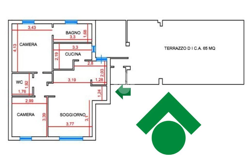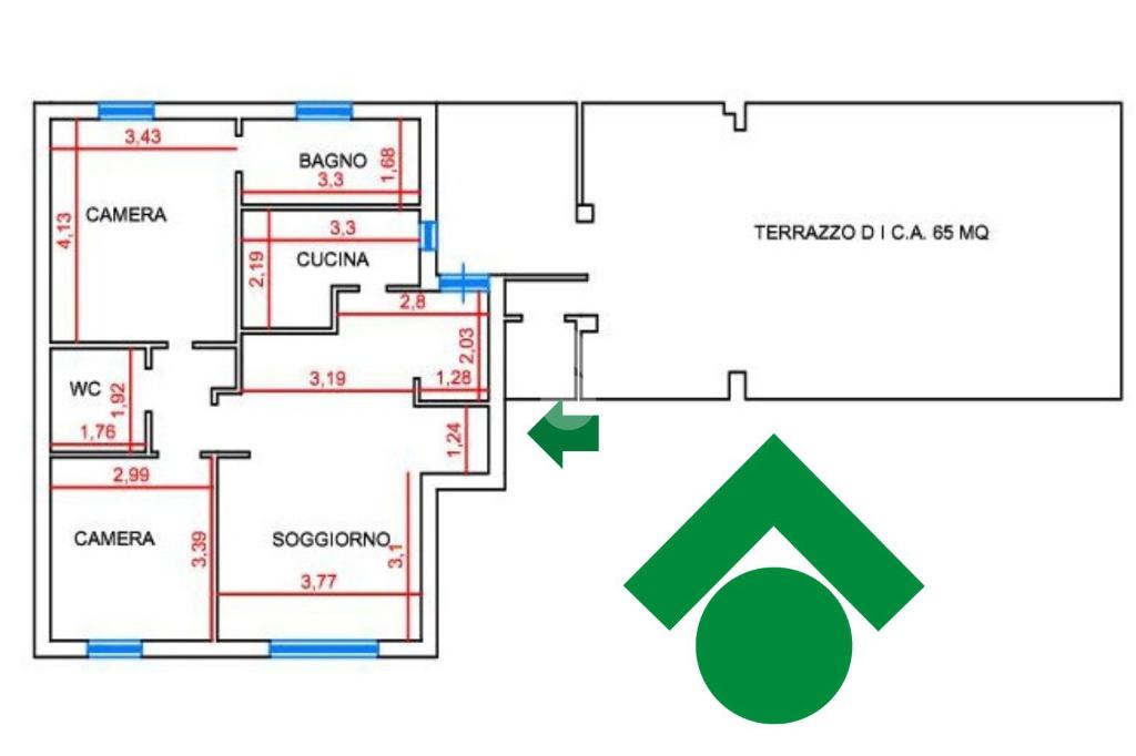 Varcando la soglia d'ingresso, ci accoglie un soggiorno di circa 28 mq, con cucinotto separato. Dal soggiorno si accede al terrazzo di circa 65 mq.